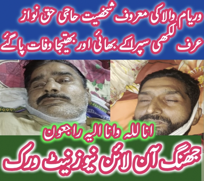 محمد افضل اور غلام عباس دونوں چچا بھتیجا مرحومین کا نماز جنازہ آج نو بجے صبح گورنمنٹ ہائیر سیکنڈری سکول وریام والا تحصیل شورکوٹ ضلع جھنگ کے نزدیک عید گاہ میں ادا کیجائے گی-