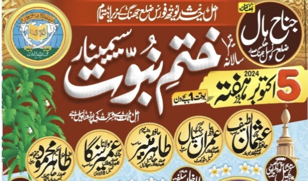 شورکوٹ اہلحدیث یوتھ فورس ضلع جھنگ کے صدر حافظ ثاقب سرور ساقی اہلحدیث یوتھ فورس ضلع جھنگ کے جنرل سیکرٹری حافظ شاہد ندیم اہلحدیث یوتھ فورس ضلع جھنگ کے سیکرٹری اطلاعات زبیر اقبال چیمہ نے 5 اکتوبر بروز ہفتہ 1بجے دن ختم نبوت سیمینار ضلع کونسل جناح ہال جھنگ منعقد ہونے والے-