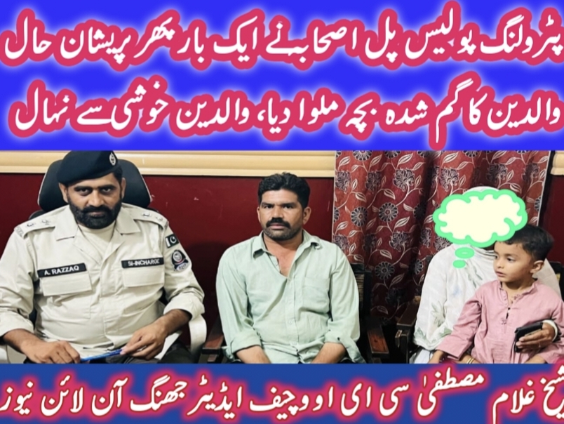 جھنگ (شیخ غلام مصطفیٰ) پٹرولنگ چیک پوسٹ پل اصحابہ جھنگ کی کارروائی، گم شدہ بچہ والدین سے ملوا دیا، والدین خوشی سے نہال، انچارج پٹرولنگ آفیسر عبدالرزاق جنجوعہ اور ان کی ٹیم کو ڈھیروں دعائیں، رپورٹ پروفیسر حکیم طاہر محمود جنجوعہ 04/10/2024 by CEO شیخ غلام مصطفی Post Views: 37 پٹرولنگ پولیس چوکی پل اصحابہ کا احسن اقدام۔ گمشدہ بچہ اپنے لواحقین سے ملوا دیا۔ والدین خوشی سے نہال۔ چوکی انچارج پٹرولنگ پولیس پل اصحابہ عبد الرزاق جنجوعہ کو دعائیں۔