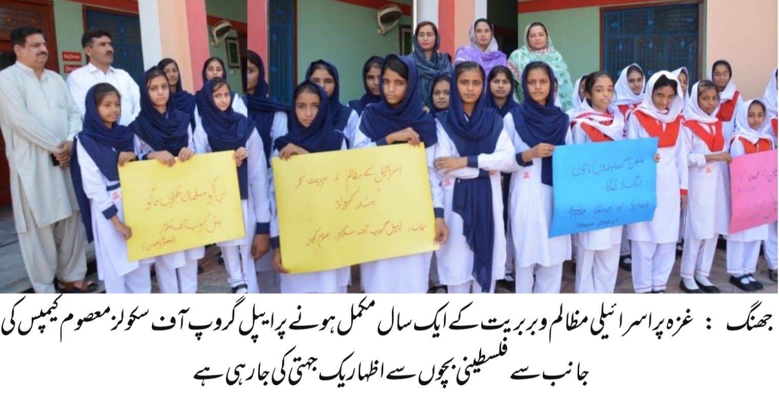 جھنگ (بیورو رپورٹ ) فلسطین میں اسرائیلی مظالم کے ایک سال مکمل ہونے پر فلسطینی بچوں سے اظہار یک جہتی کیلئے ایپل گروپ آف سکولز معصوم کیمپس جھنگ کی جانب سے تقریب کا اہتمام کیا گیا جس میں ایم ڈی ملک فیاض حسین ، پرنسپل چوہدری غلام نبی ، میڈم بشریٰ طاہر ، میڈم ریحانہ اور میڈم شمائم ریاض سمیت سٹاف سکول ہذا اور طلباء نے شرکت کی ۔
