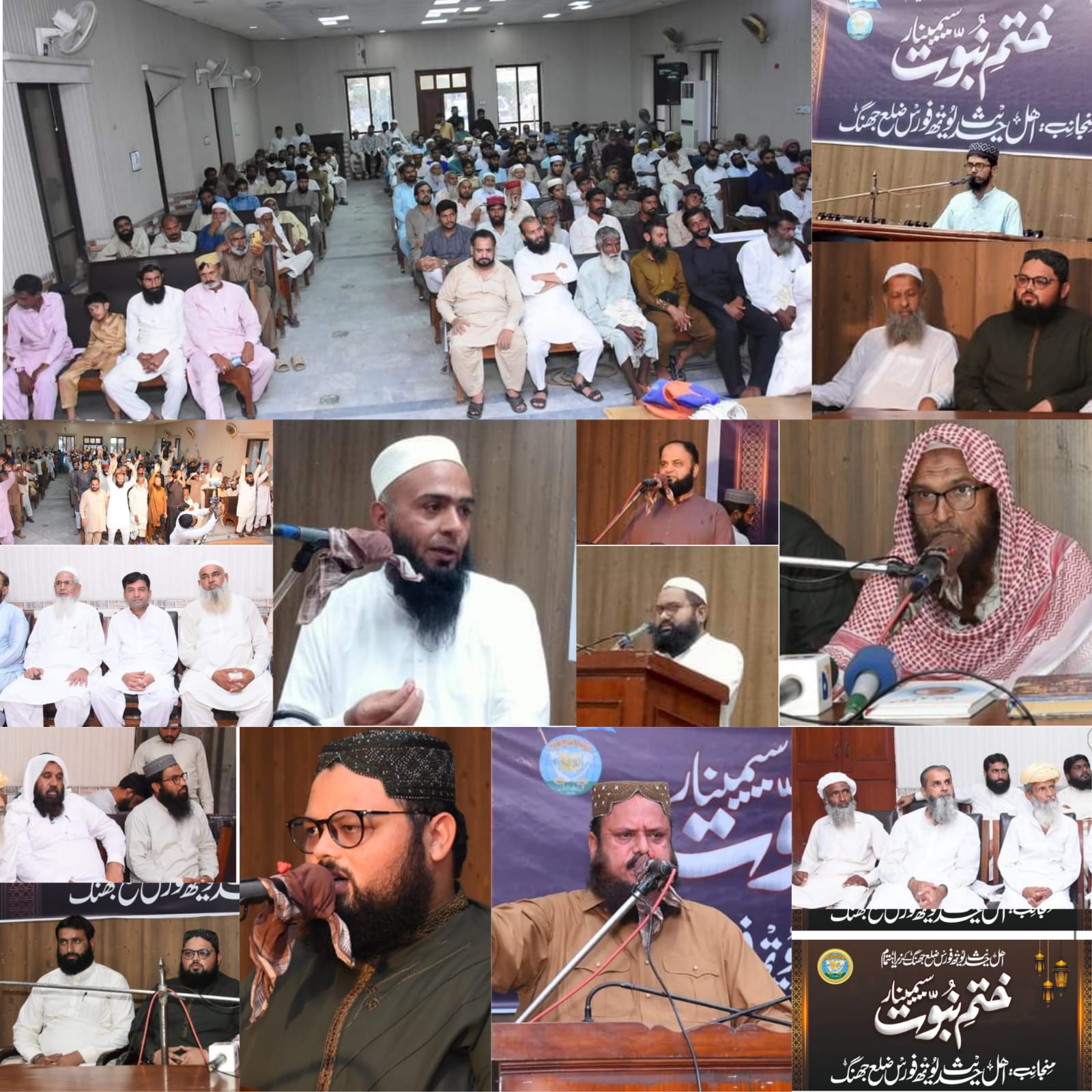 جھنگ اہلحدیث یوتھ فورس ضلع جھنگ کے زیر اہتمام تیسرا سالانہ تحفظ ختم نبوت سیمینار ضلع کونسل جناح ہال جھنگ صدر میں منعقد ہوا جس کی صدرات مرکزی جمعیت اہلحدیث تحصیل جھنگ کے امیر ماسٹر محمد یونس چوہان نے کی پروگرام کے مہمانانِ گرامی پروفیسر حکیم طاہر محمود جنجوعہ صدر جمعیت اساتذہ ضلع جھنگ طاہر خان سلفی امیرمرکزی جمعیت اہلحدیث تحصیل شورکوٹ چوہدری محمد عنصر سابق صدر چیمبر اف کامرس جھنگ حاجی دلدار صدر انجمن تاجران جھنگ حکیم انوار الحق ممبر امن کمیٹی جھنگ مہر سرفراز لڈیانہ سیال مرکزی رہنما جمعیت اساتذہ ضلع جھنگ حافظ طاہر منیر صدر اہلحدیث یوتھ فورس تحصیل احمد پور سیال سیمینار کا آغاز تلاوت کلام پاک سے ہوا اور اس کے بعد نعت رسول مقبول پیش کی تحفظ ختم نبوت سیمینار سے مناظر اسلام مولانا عمر صدیق اف گوجرانوالہ قاری جمیل اجمل گورائیہ اف ملتان مفتی اعظم جھنگ مولانا عبدالرحمن ضیاء حافظ ثاقب سرور ساقی صدر اہلحدیث یوتھ فورس ضلع جھنگ اہلحدیث یوتھ فورس تحصیل جھنگ کے صدر حافظ عثمان لطیف مولانا عمران سیال نے خطاب کرتے ہوئے کہا کہ قادیانیت جھوٹ مکار اور زندیق ہے فنتہ قادیانیت انگریز کا خود کاشت پودا ہے اسرائیلی جارجیت بربریت کی شدید الفاظ میں مذمت کرتے ہیں حکومت سے تحفظ ناموس رسالت امتناع قادیانیت آرڈینس پر سختی سے عمل درآمد کویقنی بناکر غیرشرعی قوانین کو تبدیل کرکے قران و سنت کے مطابق نظام عدل و انصاف کے مطابق عمل کیا جائے ختم نبوت ہمارے ایمان کا حصہ ہے اس کے تحفظ کےلئے کسی بھی قسم کی قربانی سے دریغ نہیں کریں گے ختم نبوت سیمینار میں اہلحدیث یوتھ فورس کے کارکنوں نے اس بات کا عزم کیا جب تک جسم میں خون کا آ خری قطرہ باقی ہے ہم ختم نبوت کا تحفظ کرتے رہیں گے ہمارے اسلاف نے مولانا نذیر حسین مولا میر ابراہیم سیالکوٹی مولانا ثناء اللہ امرتسری نے قادیانی کا ہر جگہ پر تعاقب کیا اور ان کو مرتد کافر قرار دیا گیا اور مولانا ثناء اللہ امرتسری نے مرزا قادیانی کو مباہلہ کا چیلنج کیا اور مرزا 1908 میں مرگیا اور مولانا ثناءاللہ امرتسری1948 میں سرگودھا میں وفات پائی اور اس طرح اہلحدیثوں کے سر فخر سے بلند ہوئے انہوں نے کہا کہ علامہ احسان الہی ظہیر شہید نے اہلحدیث یوتھ فورس کے نوجوانوں میں ختم نبوت کا جذبہ پیدا کیا اور اس دور میں ہمیں ختم نبوت کی چوکھٹ کی چوکی داری کرنی ہے جو لوگ ہمارے ملک پاکستان کی ترقی کو دیکھ کر خوش نہیں اور ملک کی املاک کو نقصان پہنچانے والے وہ ملک پاکستان کے خیر خواہ نہیں پاک فوج کے جوان دن رات ہمارے ملک کا دفاع کرتے ہیں حافظ شاہد ندیم ضلعی جنرل سیکرٹری اہلحدیث یوتھ فورس ضلع جھنگ نے تما م آنے والے احباب کا شکریہ ادا کیا اور بالخصوص ڈپٹی کمشنر جھنگ عمیر کا شکریہ ادا کیا کہ جنہوں نے ہمیں جناح ہال میں پروگرام کی اجازت دی مفتی عبدارحمن ضیاء نے اختتامی دعا کرائی ک اللہ پاک ہمارے ملک کی حفاظت فرمائے ملکی استحکام اور ضلع میں امن و امان رکھے ضلع بھر سے ائےتمام مہمانوں کیلئے ضیافت کا خوب اہتمام کیا گیا مہمانوں نے سیر ہو کر کھانا کھایا اللہ کریم پروگرام کے محسنین معاونین کے عمل کو قبول کر کے نجات کا زریعہ بنائے امین