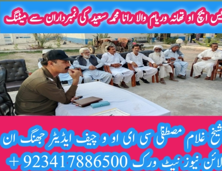 شور کوٹ ،رانا سعید احمد سب انسپکٹر ایس ایچ او تھانہ وریام والا نے تھانہ کے نمبرداروں سے میٹنگ کی جس میں نمبرداران کی کثیر تعداد نے شرکت کی میڈیا سے گفتگو کرتے ہوئے رانا سعید احمد نے کہا کہ نمبرداروں میڈیا اور پولیس کا اپس میں چولی دامن کا ساتھ ہے ہم نے مل کر علاقے سے کرائم کا خاتمہ کرنا ہے-