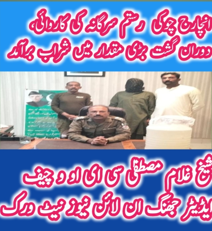 شور کوٹ،ڈی پی او جھنگ کیپٹن ریٹائرڈ افتخار کیانی کی ہدایت پر ایس ایچ او تھانہ وریام والا رانا محمد سعید کی زیرنگرانی انچارج چوکی رستم سرگانہ محمد اصف نواز انجم معہ ملازمین نے دوران گشت خاور عباس ولد غلام قاسم سربانہ سکنہ محرم سیال سے 28لیٹر شراب برآمد کی جبکہ محمد اقبال ولد محمد امیر علیخنانہ سکنہ کوٹ عمردراز سے 23لیٹر شراب برامد کرکے ملزمان کے خلاف تھانہ وریام والا میں محرر ناصر خان بلوچ نےدو الگ الگ مقدمات درج کردیئے –