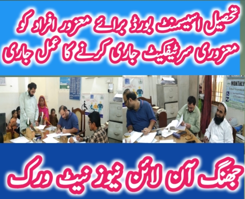 جبکہ 11 افراد بورڈ میں حاضر نہ ہوئے اس موقع پر ڈاکٹر اظہر حسنین نے بتایا کہ محکمہ صحت پنجاب اور محکمہ سوشل ویلفیئر و بیت المال پنجاب کے تعاون سے تحصیل ہیڈ کوارٹر ہسپتال شورکوٹ میں باقاعدگی سے معذور افراد کی اسیسمنٹ کے لیے بورڈ کا انعقاد کیا جا رہا ہے –