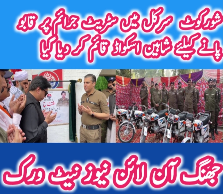 شورکوٹ (شیخ غلام مصطفیٰ) سٹریٹ کرائم پر قابو پانے کیلئے شورکوٹ سرکل میں شاہین اسکواڈ قائم کر دیاگیا ، کھلی کچہری میں میڈیا کی جانب سے کیا گیا مطالبہ ڈی پی او جھنگ نے پورا کر دیا، رپورٹ پروفیسر حکیم طاہر محمود جنجوعہ ،مہر ریاض موہانہ ،ڈاکٹر غلام اللہ فاروقی
