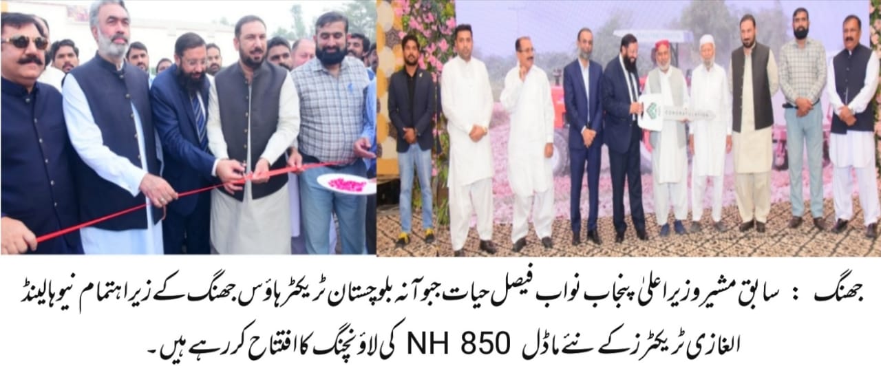 جھنگ ( ) سی او بلوچستان ٹریکٹر ہاؤس ( بااختیار ڈیلرز غازی ٹریکٹرز ) جنید خان بلوچ کے زیر اہتمام نیو ہالینڈ الغازی ٹریکٹرز کے نئے ماڈل NH 850 کی لاؤنچنگ تقریب کا انعقاد جگر مارکی جھنگ میں کیا گیا جس کا افتتاح سابق مشیر وزیر اعلیٰ پنجاب نواب فیصل حیات جبوآنہ و سابق چیئرمین ضلع کونسل نواب بابر خان سیال نے فیتہ کاٹ کر کیا ۔