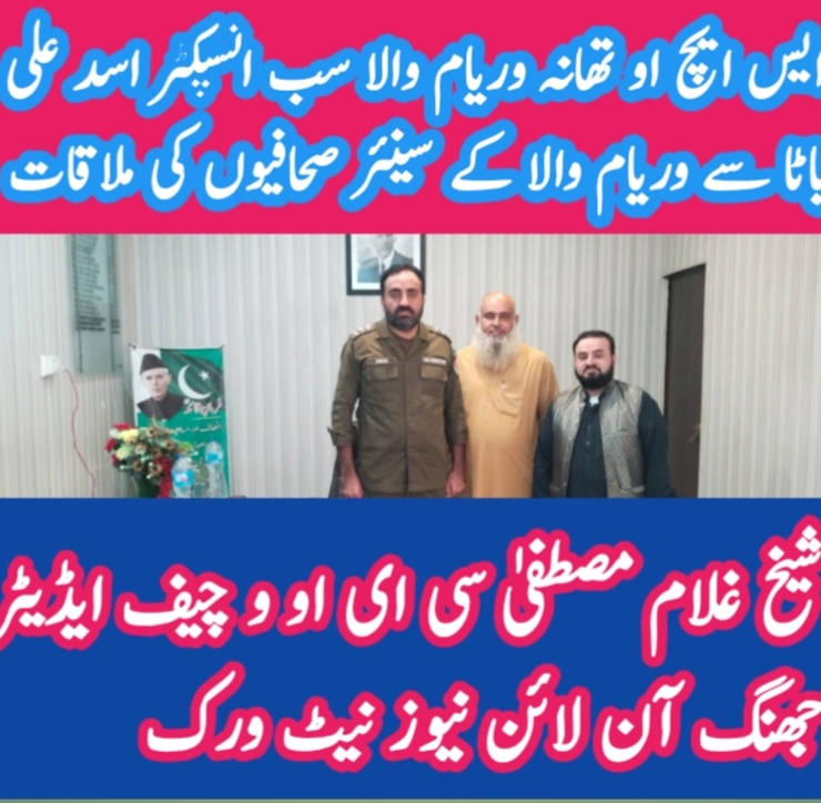 وریام والا جھنگ (شیخ غلام مصطفیٰ) جرائم پیشہ افراد کے خلاف بدستور کاروائیاں جاری رہیں گی، ٹھکری پہرے کے نظام کو مزید بہتر بنا کر علاقہ کو جرائم سے پاک کیا جا سکتا ہے اور لوگ سکھ کی نیند سو سکتے ہیں، ان خیالات کا اظہار ایس ایچ او تھانہ وریام والا سب انسپکٹر اسد علی باٹا نے چارج سنبھالنے کے بعد سینئر صحافیوں شیخ غلام مصطفیٰ ،پروفیسر حکیم طاہر محمود جنجوعہ سے ملاقات کے دوران کیا،