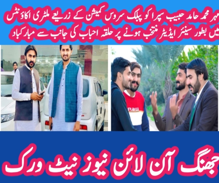 جھنگ کا نواحی علاقہ کوٹ دیوان سے مہر محمد حامد حبیب سپرا ولد ماسٹر محمد حبیب قوم سپرا کوٹ دیوان سکول کو فیڈرل پبلک سروس کمیشن کے ذریعے ملٹری اوکاونٹس میں سینئر ایڈیٹر BS 16 لاھور منتخب ھونے پر مبارک باد پیش کرتے ھیں-