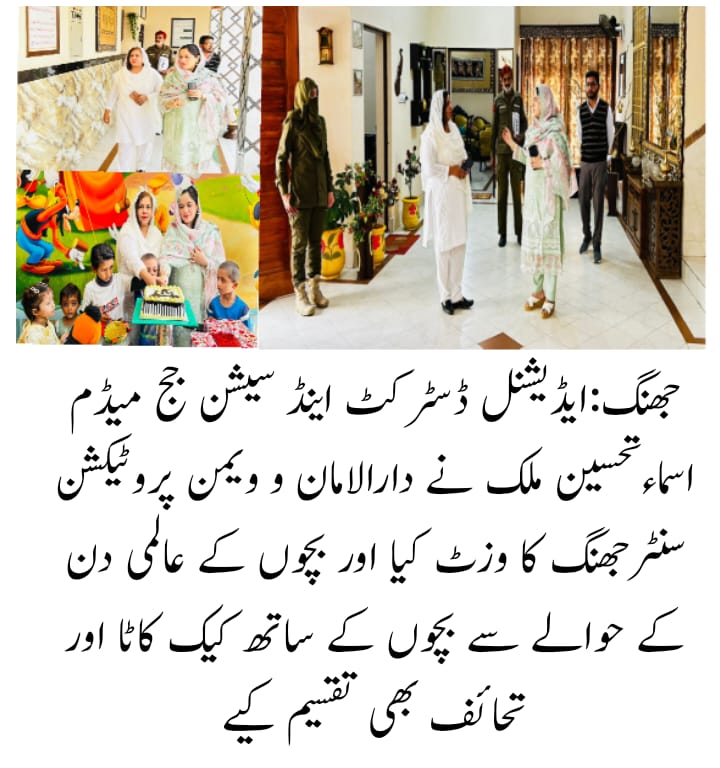 جھنگ (۔ ) ڈسٹرکٹ اینڈ سیشن جج جھنگ کی ہدایت پر ایڈیشنل ڈسٹرکٹ اینڈ سیشن جج جھنگ میڈم اسماء تحسین ملک نے دارالامان/ویمن پروٹیکشن سنٹر ٹوبہ روڑ جھنگ کی انسپکشن کی اور تمام شعبہ جات کا جائزہ لیا اور وہاں مقیم خواتین سے ملاقات کی-