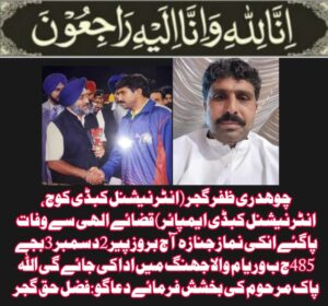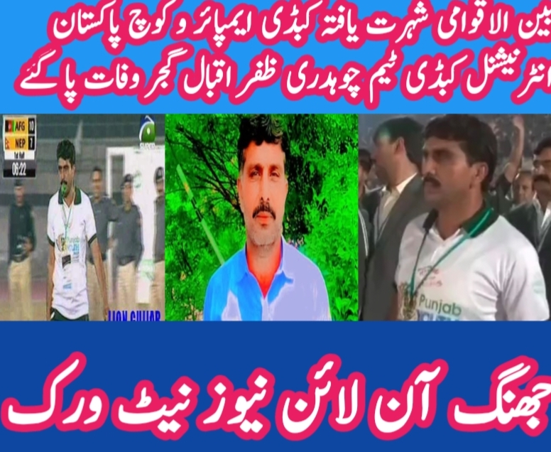 بین الاقوامی شہرت یافتہ کبڈی ایمپائر و کوچ پاکستان انٹرنیشنل کبڈی ٹیم چوھدری ظفر اقبال گجر PET گورنمنٹ E/S چک نمبر485نائب صدر پنجاب ٹیچرز یونین ضلع جھنگ اورکوچ پاکستان انٹرنیشنل کبڈی ٹیم رضاٸے الہی سے وفات پا گئے ہیں-