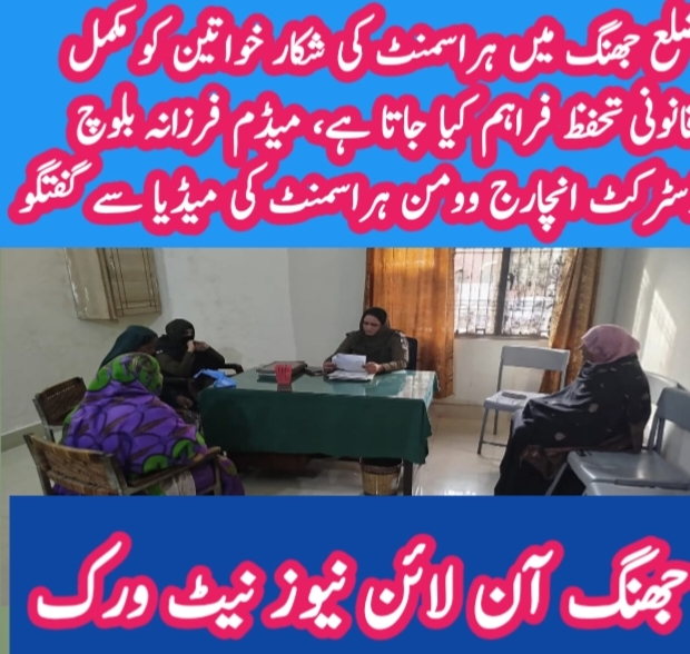 میڈم فرزانہ بلوچ آجکل ڈسٹرکٹ انچارج وویمن ہراسمنٹ ڈیوٹی سر انجام دے رہی ہیں انہوں نے میڈیا سے ملاقات کے دوران کہا کہ ضلع بھر میں کسی بھی خواتین کو کوئی ہراساں کرے یا تنگ کرے تو فوری اطلاع دے-