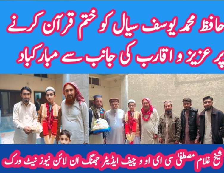 جھنگ کے نواحی علاقہ تھانہ وریام والا کی حدود بستی نور آباد کے رہائشی محمد عیسیٰ کے بھائی حافظ محمد یوسف نے حفظ القرآن مجید مکمل کر لیا-