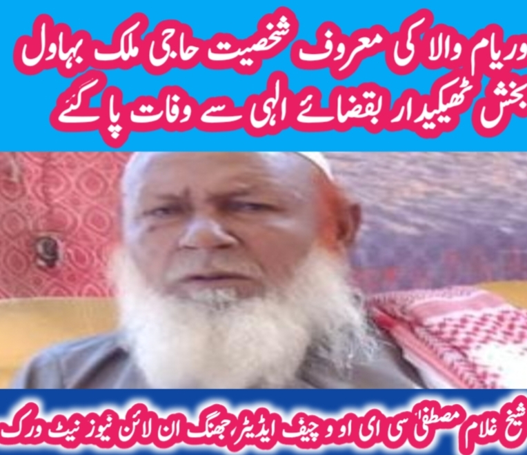 وریام والا جھنگ (شیخ غلام مصطفیٰ) معروف سیاسی سماجی شخصیت حاجی ملک محمد اقبال کے بھائی ماسٹر ملک محمد رفیق کے والد حکیم محمد عرفان ملک محمد عمران کے دادا ملک حاجی بہاول بخش انتقال کر گئے ہیں-