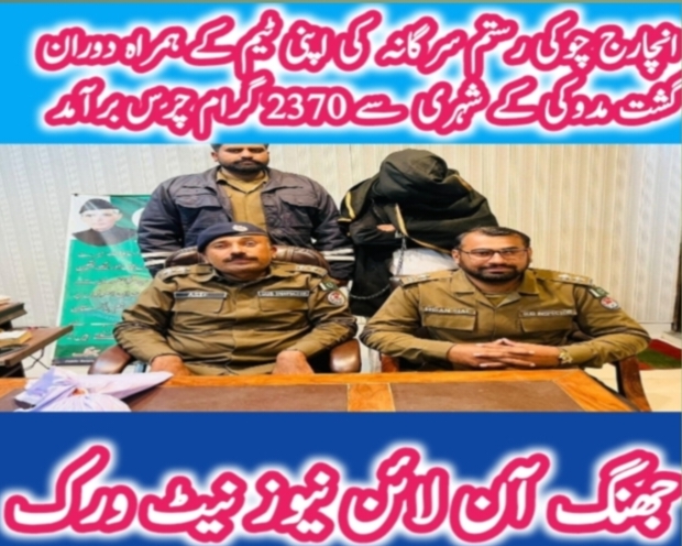 وریام والاجھنگ (شیخ غلام مصطفیٰ) ایس ایچ او تھانہ وریام والا اسد علی باٹا کی زیرنگرانی محمد اصف نواز انجم انچارج چوکی رستم سرگانہ نے دوران گشت معہ ملازمین اختر عباس ولد نصیر احمد قوم گٹ سکنہ مدوکی2370 گرام چرس برآمد کرکے ملزم کے خلاف مقدمہ درج کروادیا گیا –