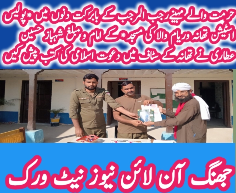 وریام والاجھنگ (شیخ غلام مصطفیٰ) حرمت والے مہینےرجب المرجب کے بابرکت دنوں میں *پولیس اسٹیشن تھانہ وریام والا کی مسجد* کے امام و مبلغ شہباز حسین عطاری کا تھانہ وریام والا کے سٹاف کو دعوت اسلامی کتب پیش کیں اور تھانہ میں موجود افراد کو نیکی کی دعوت دی، رپورٹ ثمر عباس بیوروچیف جھنگ آن لائن نیوز نیٹ ورک