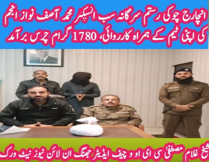 جھنگ کیپٹن (ر ) بلال افتخار کیانی کے احکامات پر اور ایس ایچ او تھانہ وریام والا اسد علی باٹا کی ہدایت پر منشیات فروشوں کے خلاف غیر معمولی کاروائیوں کا سلسلہ جاری، انچارج چوکی رستم سرگانہ آصف نواز انجم کی دبنگ کاروائی دوران گشت پل بوتھانیانوالی رستم سرگانہ سے مخبر کی اطلاع پر ملزم شعیب اختر ولد اقبال قوم کمیانہ سکنہ موضع گلمالہ سے دوران چیکنگ 1780 گرام چرس برآمد کرکے مقدمہ درج کر لیا –