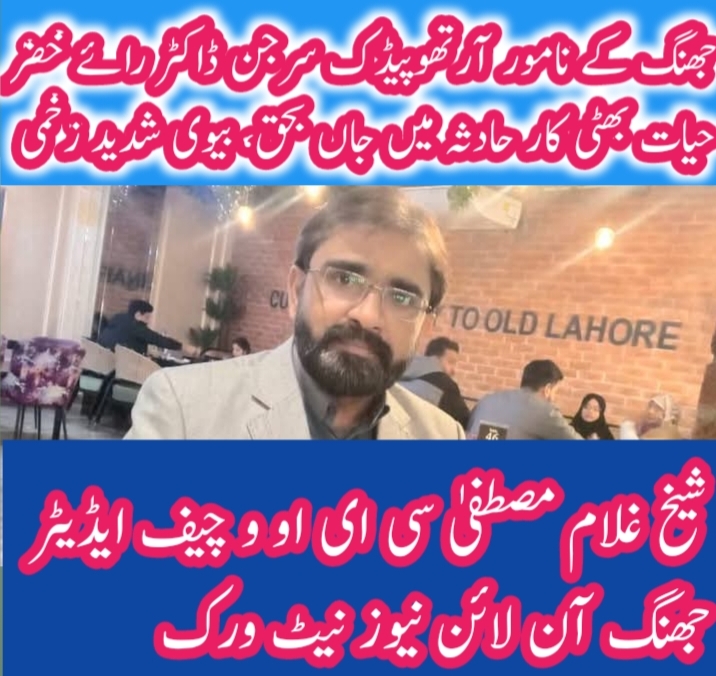 انتہائی افسوسناک خبر جھنگ کےنامور آرتھو پیڈک سرجن ڈاکٹر خضر بھٹی کار حادثہ میں جاں بحق ۔بیوی ڈاکٹر شمائلہ خضر شدید زخمی حالت میں اسپتال داخل