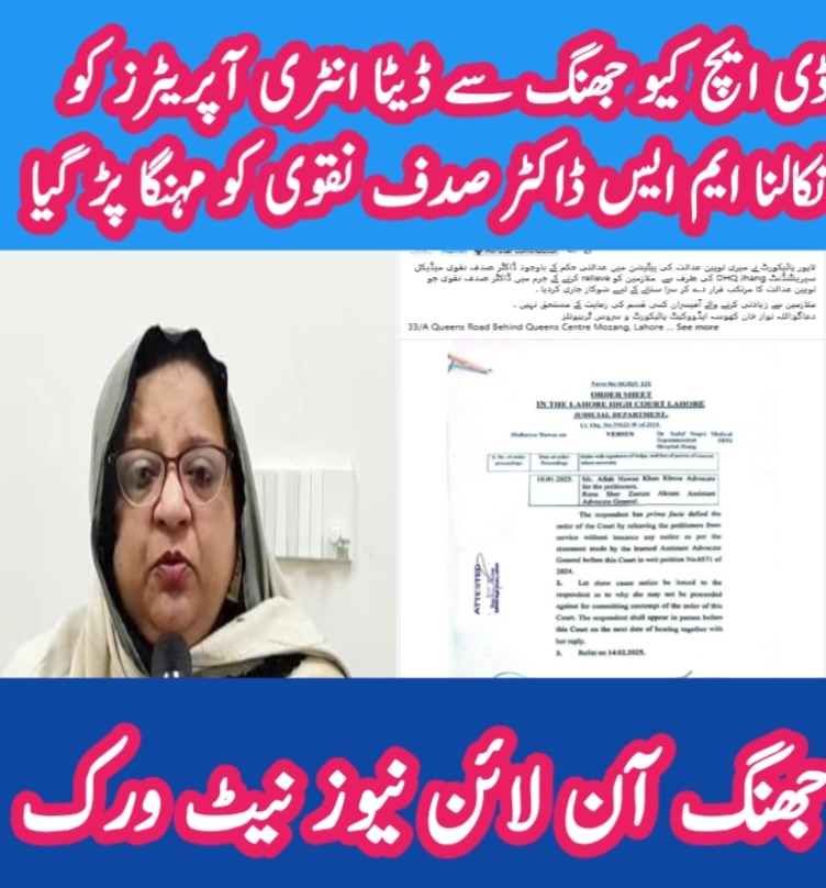 ڈسٹرکٹ ہسپتال جھنگ کی ایم ایس ڈاکٹر صدف نقوی کی جانب سے ڈیٹا انٹری آپریٹرز کو غیر قانونی طریقے سے نکالنے پر ھائی کورٹ کی کاروائی، عدالتی حکم کی توہین کرنے پر شوکاز نوٹس جاری