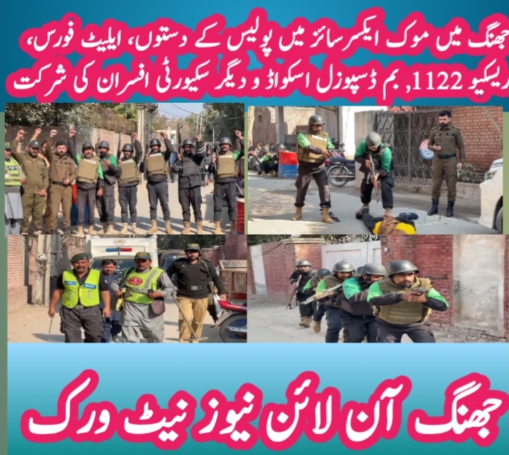 جھنگ ( ) ڈی پی او کیپٹن (ر) بلال افتخار کیانی کے احکامات پر ڈی پی او آفس میں موک ایکسرسائز کا انعقاد. موک ایکسرسائز میں پولیس کے دستوں، ایلیٹ فورس، ریسکیو 1122, بم ڈسپوزل اسکواڈ و دیگر سکیورٹی افسران کی شرکت .
