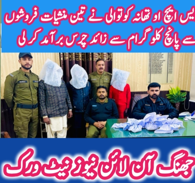 تفصیلات کے مطابق ڈی پی او جھنگ کے احکامات پر پولیس کا منشیات فروشوں کے خلاف کریک ڈاؤن جاری ہے ۔ پولیس تھانہ کوتوالی نے مخبر کی اطلاع پر تین منشیات فروشوں کو گرفتار کرکے پانچ کلوگرام سے زائد چرس برآمد کرلی ۔ گرفتار ملزمان میں غلام مرتضی ، عمران اور عرفان شامل ہیں جنکے خلاف مقدمات درج کر لئے گئے ہیں ۔ ڈی پی او کیپٹن (ر) بلال افتخار کیانی نے کوتوالی پولیس کو شاباش دیتے ہوئے منشیات فروشوں کے خلاف مزید کریک ڈاؤن کی ہدایت کیں ۔