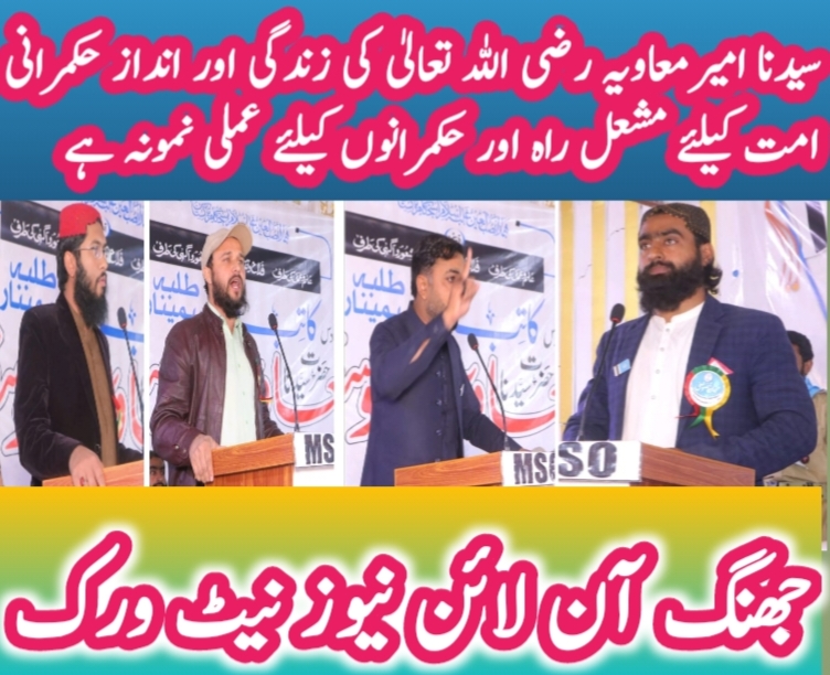 جھنگ :سیدنا امیرمعاویہ رضی اللہ تعالیٰ کی زندگی اور انداز حکمرانی امت کیلئے مشعل راہ اور حکمرانوں کیلئے عملی نمونہ ہے عبد الرؤف چوھدری، حضرت سیدناامیرمعاویہ ؓ ایک عظیم جرنیل،سپہ سالاراورمیدان ِحرب کے نڈرشہسوارتھے۔ناظم عمومی ایم ایس او پاکستان، رپورٹ حکیم طاہر محمود جنجوعہ ،ڈاکٹر غلام اللہ فاروقی بیوروچیف جھنگ آن لائن نیوز