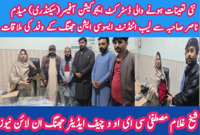 (جھنگ) سے نۓ تعینات ہونے والی ڈسٹرکٹ ایجوکیشن آفیسر(سیکنڈری) میڈم ناصر صاحبہ سے لیب اٹنڈنٹ ایسوسی ایشن جھنگ کے عہدیداران کی ویلکم ملاقات ہوئی جس میں انہوں نے مختلف سکولز میں لیب اٹنڈنٹ کے مسائل پر تفصیلی گفتگو کی –