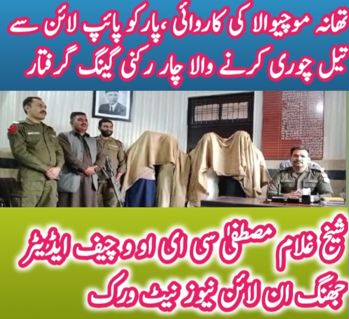 جھنگ( ) پارکو پائپ لائن سے تیل چوری میں ملوث چار رکنی گینگ گرفتار ۔ ملزمان تھانہ موچیوالا کے علاقہ میں پارکو پائپ لائن سے تیل چوری کی وارداتوں کا ارتکاب کرتے تھے۔ تفصیلات کے مطابق پولیس تھانہ موچی والا نے پارکو پائپ لائن سے تیل چوری کرنے والا چار رکنی گینگ گرفتار کرلیا ۔