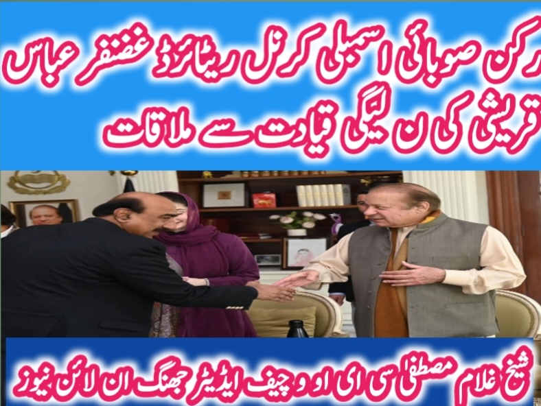 جھنگ (شیخ غلام مصطفیٰ) رکن صوبائی اسمبلی کرنل ریٹائرڈ مخدوم کرنل غضنفر عباس شاہ قریشی ایم پی اے نے سابق وزیر اعظم میاں محمد نواز شریف وزیر اعلی پنجاب محترمہ مریم نواز شریف سے لاھور میں ملاقات کی اور اپنے علاقے کے مسائل پر گفتگو کی-