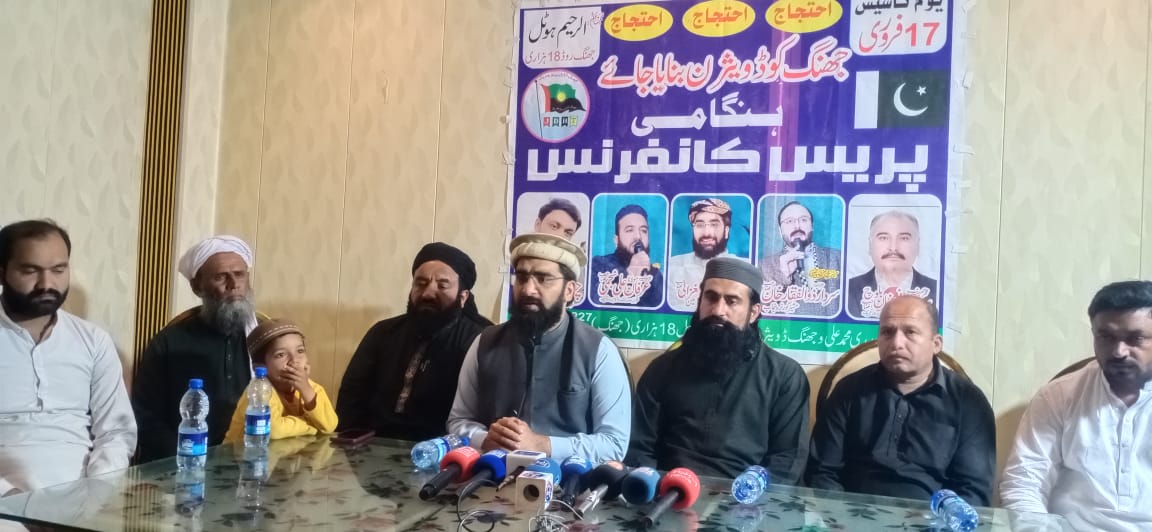 جھنگ ڈویژن بنائو تحریک کے شریک چیئرمین مولانا حافظ عمیر الغزالی نے کہا ہے کہ لیہ ڈویژن بنانے کیلئے جھنگ کو ایک بار پھر تقسیم کرنے کی باتیں تشویشناک ہیں ، عوام اب اپنے ضلع کی مزید تقسیم برداشت نہیں کریں گے ۔جھنگ کو ڈویژن بنانے کیلئے تحریک کا دائرہ لاہور تک بڑھائیں گے، اٹھارہ ہزاری مقامی ہوٹل میں تحریک کے سینئر وائس چیئرمین مولانا عبد الواحد صدیقی ، مرکزی صدر مولانا عرفان علی نجمی تحصیل صدر چوہدری محمد علی ،سرپرست ملک ارشاد حسین ،چوہدری خالد شہزاد،چوہدری محمد طیب اور دیگر کے ہمراہ پریس کانفرنس سے خطاب کرتے ہوئے انہوں نے کہا ایک ایم پی اے کے حوالے سے لیہ کو ڈویژن بنانے کی خبر وہاں کے لوکل اخبار میں لگی ، احمدپور سیال اور شورکوٹ کو جھنگ سے کاٹ کر لیہ میں شامل کرنے کی باتیں ہورہی ہیں ، جس پر جھنگ کے پی ٹی آئی سے تعلق رکھنے والے دو ایم پی ایز نے اسمبلی میں احتجاج بھی ریکارڈ کروایا مگر اب تک حکومت پنجاب نے اس کی کوئی تردید کی ہے اور نہ ہی کوئی پالیسی بیان دیا ہے جس پر یہاں کے عوام میں سخت غم و غصہ پایا جاتا ہے ۔انہوں نے کہا کہ ہمیں کسی نئے ڈویژن پر کوئی اعتراض نہ ہے ، مگر جھنگ تاریخی ضلع ہے جس سے نکلنے والی تحصیلیں اضلاع اور ڈویژن بن گئے مگر جھنگ کو جان بوجھ نظر انداز کیا گیا ۔ اب بھی آبادی اور جغرافیہ کے لحاظ سے جھنگ کو سب سے پہلے ڈویژن بنانا اس کا حق ہے ، جس کیلئے تحریک کو مزید تیز کیا جائے گا ۔حکومت پنجاب جھنگ کو ڈویژن بنا کر اسکی پسماندگی اور محرومیوں کا ازالہ کرے ۔اور اٹھارہ ہزاری سمیت تمام تحصیلوں کے مسائل حل کرے، انہوں نے کہا کہ جھنگ کے شکست خوردہ ٹکٹ ہولڈر اقتدار میں ہیں اور وہ کرہشن کیلئے ضلع کے تمام اختیارات استعمال کررہے ہیں ۔مگر جھنگ کو ڈویژن بنانے کیلئے وہ مصلحت پسندی کا شکار ہیں اور اپنی حکومت سے بات کرنے کو تیار نہ ہیں ۔ عوام ان کا محاسبہ کریں ۔انہوں نے مزید کہا کہ تحریک کا دائرہ بڑھانے کیلئے 24 فروری کو جھنگ میں اہم اعلان کریں گے ۔اسکے علاوہ ملک ارشاد حسین کو سرپرست ،حاجی جاوید خان کو سرپرست اعلی اور چوہدری محمد علی کو صدر مہر الطاف علیخنانہ کو جنرل سیکرٹری نامزد کر دیا گیا
