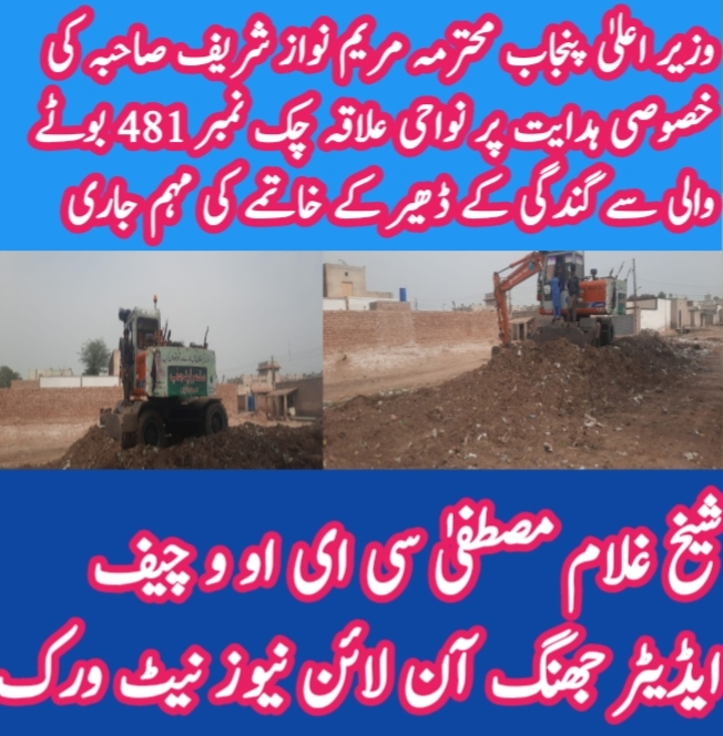 جھنگ کے نواحی علاقہ چک 481 میں گندگی کے ڈھیر لگے ہوئے تھے جو کہ آئے روز بیماریوں کا سبب بن رہے تھے جس کو اٹھوانے کے لئیے متعدد بار خبریں شائع کی گئی متعلقہ انتظامیہ سے بار بار رابطہ کیا گیا جو کہ اب صاف ستھرا پنجاب کے تحت متاثرہ علاقہ سے کوڑا کرکٹ اٹھوانے کے لئیے مشینری لگا دی گئی-