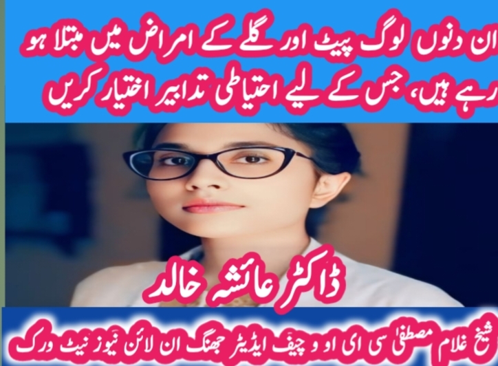 جھنگ ( ) علی احمد خاں ہسپتال ایمرجنسی کی میڈیکل آفیسر محترمہ ڈاکٹر عائشہ خالد نے کہا ہے کہ ان دنوں پیٹ کے امراض میں اضافہ دیکھنے میں آرہا ہے اور لوگ پیٹ اور گلے کے امراض میں مبتلا ہو رہے ہیں-
