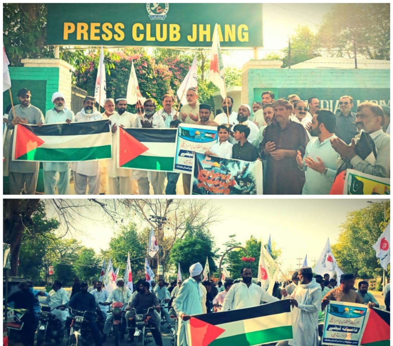 جھنگ(انیس پوری)انجمن سرفروشان اسلام جھنگ کے زیر اہتمام زیر سرپرستی چوہدری اظہر نواز، چوہدری حق نواز سابقہ کونسلر، مہر مجید نول، مہر انور نول، محمد آصف، حافظ مشتاق اور مہر اکرم نول احتجاجی ریلی کا انعقاد کیا گیا جوکہ آستانہ انجمن سرفروشان محلہ آرائیاں والا سے شروع ہوکر فوارہ چوک سے گزرتی ہوئی پریس کلب اختتام پذیر ہوئی اس ریلی اسرائیلی مظالم کے خلاف شرکاء نے کتبے اٹھا رکھے تھے جس پر اسرائیل کے خلاف نعرے لکھے ھوئے تھے کہ اسرائیل نامنظور سلطنت،اسرائیل مصنوعات کا فوری بائیکاٹ وغیرہ اس کے علاوہ اسرائیلی مظالم کے خلاف شدید نعرے بازی کی گی مقررین نے میڈیا سے گفتگو کی اسلامی ممالک بالخصوص پاکستان کے حکمرانوں سے پرزور مطالبہ کیا ہے مشکل کی اس گھڑی میں فلسطینی بھائیوں کا بھر پور ساتھ دیا جائے اور اسرائلی مظالم کو روکنے کے لیے بھرپور عملی اقدام کیا جائے دنیا میں مسلمانوں کی تعداد اربوں میں ہے ہر اسلامی ملک کے پاس بہت بڑی بڑی افواج ہیں اگر تمام اسلامی ملک یک جاں ہوکر اسرائیلی مظالم کے خلاف کھڑے ہو جائیں تو یہ مسئلہ ایک ہی دن میں حل ہوسکتا ہے اس کے بعد دعائیہ کلمات و فقرات کے ساتھ ریلی کا اختتام ہوا اور فلسطین کی مظلوم عوام کے حق میں دعا کی گئی۔