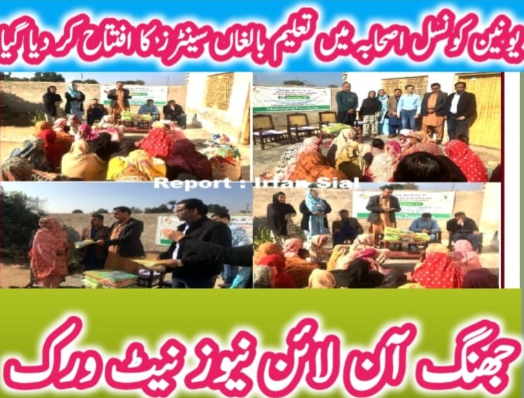 رپورٹ (عرفان حیدر سیال / ڈویژنل بیوروچیف جھنگ آن لائن نیوز نیٹ ورک )نیشنل کمیشن فار ہیومن ڈیویلپمنٹ جھنگ شکرگنج فاؤنڈیشن جھنگ لوکل کمیونیٹی اور ڈسٹرکٹ ایجوکیشن اتھارٹی جنگ کے باہمی تعاون سے یونین کونسل اصحابہ میں دو تعلیمی بالغاں سینٹرز برائے خواتین کا افتتاح کیا گیا اس تقریب کے مہمانان خصوصی ملک احسان اللہ کمبو ڈپٹی ڈائریکٹر این سی ایچ ڈی جھنگ اور شیخ مصطفی سلیم ڈائریکٹر شکرگنج ملز جھنگ, ڈاکٹر شاہد حسین تھ-