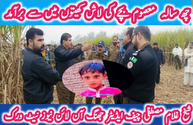 جھنگ (شیخ غلام مصطفیٰ ) بستی موضع باغ کدلتھی میں ایک انتہائی افسوسناک واقعہ پیش آیا جہاں ایک ماہ سے لاپتہ 6 سالہ ہتیم بچے فرازعلی کی لاش کماد کی فصل سے برآمد ہوئی۔ مقامی افراد فصلِ کماد کاٹ رہے تھے کہ اس دوران بچے کی لاش دکھائی دی، جس پر فوری طور پر پولیس کو اطلاع دی گئی۔