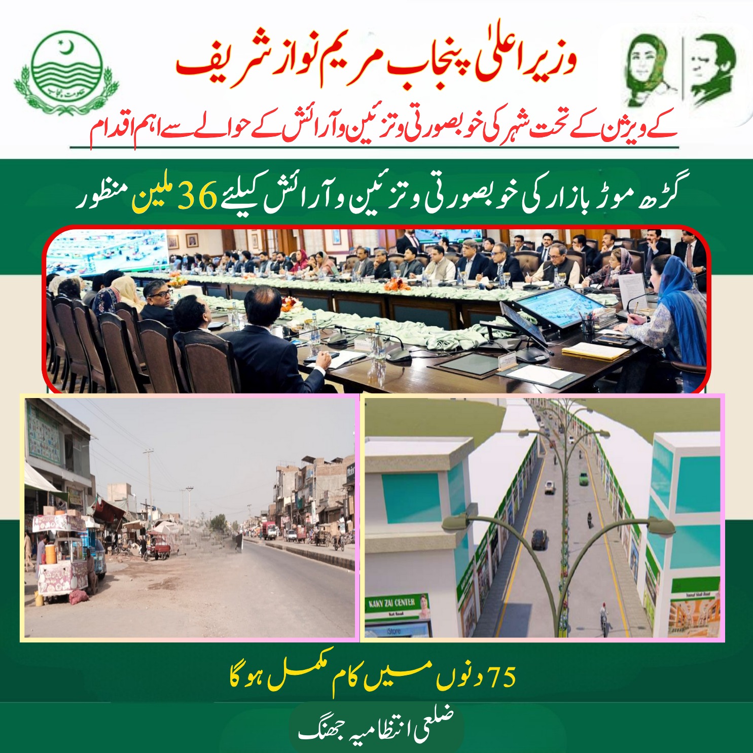 وزیر اعلیٰ پنجاب مریم نواز شریف کے ویژن کے تحت شہر کی خوبصورتی و تزئین و آرائش کے حوالے سے اہم اقدام۔گڑھ موڑ بازار کی خوبصورتی و تزئین و آرائش کیلئے 36 ملین منظور