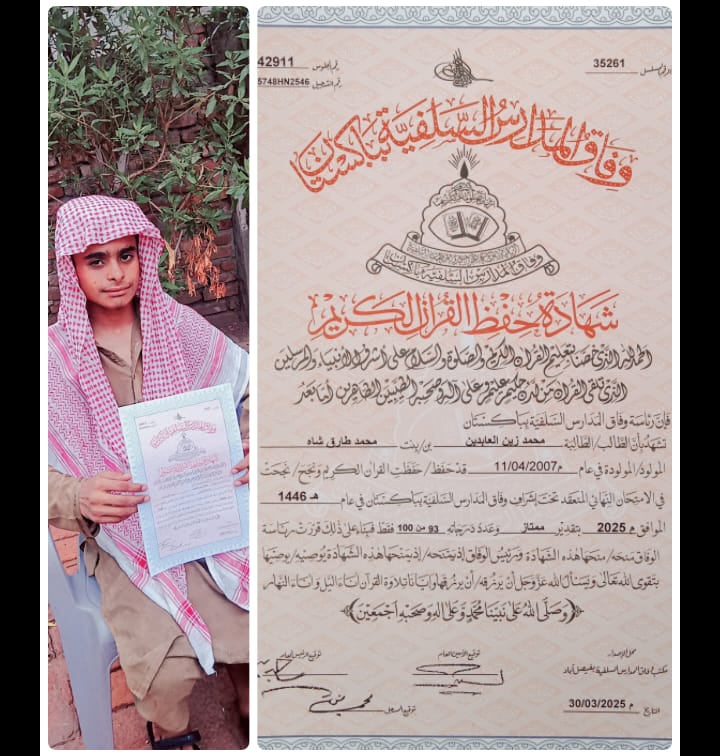 جھنگ۔(پیر سید محمد طارق شاہ فلاحی و سماجی ورکر) جھنگ۔پیر سید محمد طارق شاہ فلاحی و سماجی ورکر مبارک ویلفیئر کے لخت جگر پیر سید حافظ زین العابدین شاہ نے الحمداللہ اسی سال وفاق المدارس السلفیة الباکستان (جامعہ تعلیم القرآن و الحدیث کوٹلہ محمد ظریف خان شورکوٹ)سے اچھے نمبروں کا امتحان پاس کیا اور نمایاں … Read more
