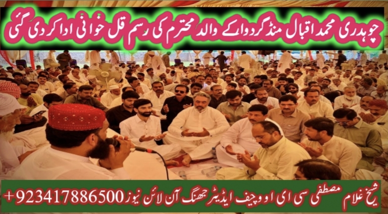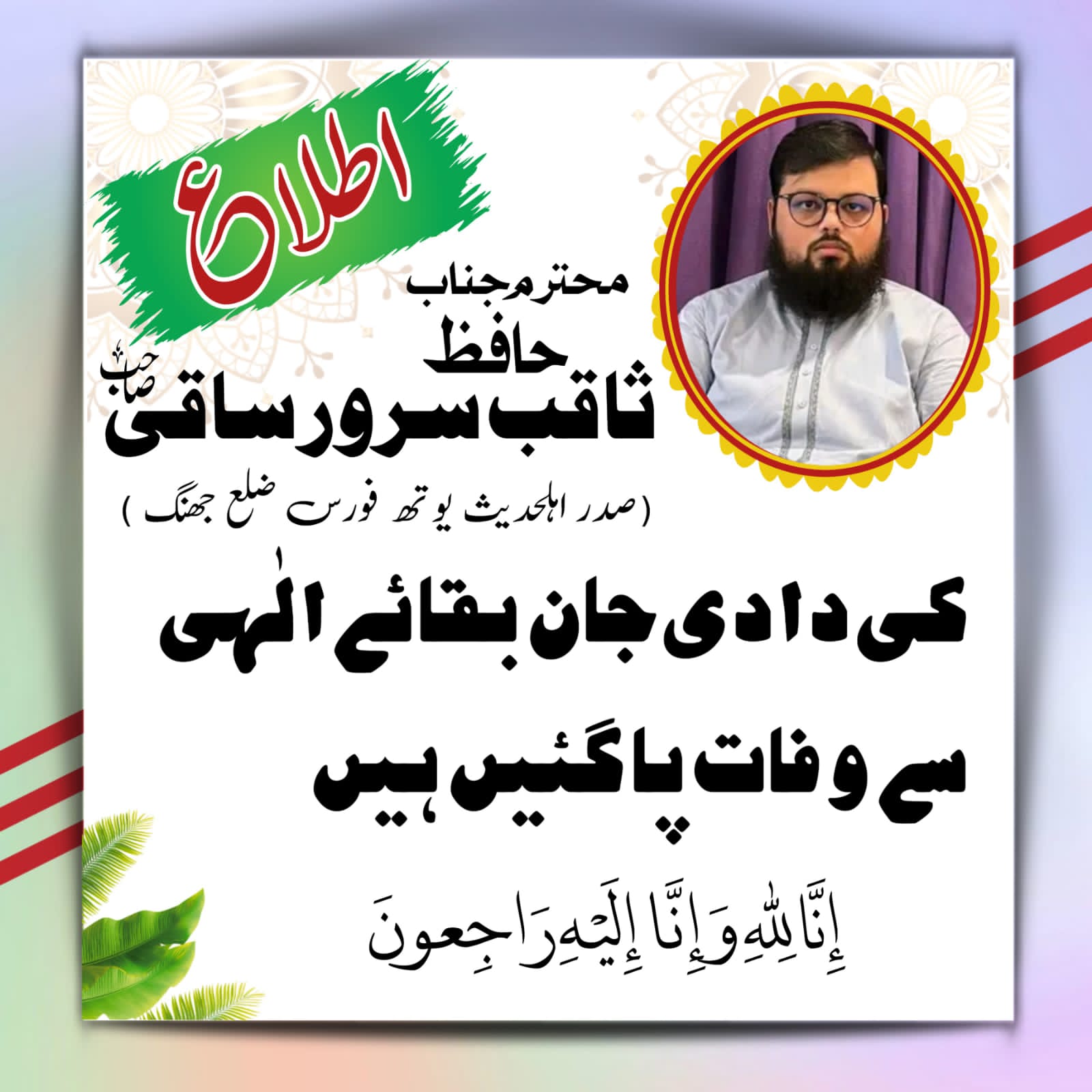 وریام والا :حافظ ثاقب سرور ساقی صدر اہلحدیث یوتھ فورس ضلع جھنگ کی دادی محترمہ وفات پا گئی ہے مرحومہ کی نمازِ جنازہ رات 9بجے ادا کیجائے گی ،رپورٹ حکیم طاہر محمود جنجوعہ