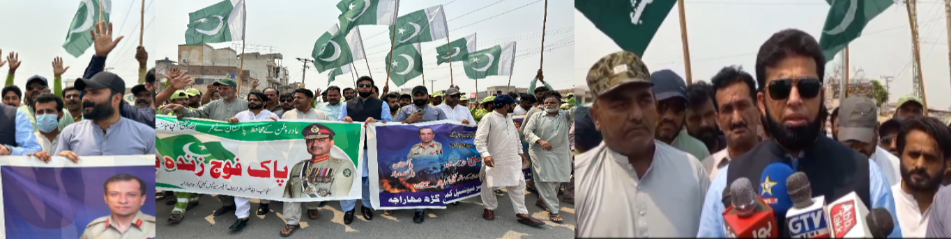 گڑھ مہاراجہ(رانا فیصل اقبال)انڈیا کی جانب سے رات کے اندھیرے میں پاکستان میں بزدلانہ کاروائی کے خلاف پاک فوج کی جانب سے بھرپور کاروائی کرنے پر تحصیل انتظامیہ ،گڑھ مہاراجہ پریس کلب انجمن تاجران ،سول سوسائٹی کی جانب سے پاک فوج کے حق میں ریلی کا انعقاد گڑھ موڑ چوک پر کیا گیا،ریلی کی قیادت اسسٹنٹ کمشنر/ایڈمنسٹریٹر میونسپل کمیٹی گڑھ مہاراجہ وقاص ظفر نے کی جس میں میونسپل کمیٹی عملہ سمیت میڈیا نمائندگان انجمن تاجران ،سول سوسائٹی سمیت شہریوں کی بڑی تعداد نے شرکت کی
