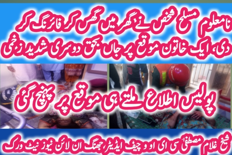 گڑھ مہاراجہ(شیخ غلام مصطفیٰ )نامعلوم شخص کی گھر میں گھس کر فائرنگ، ایک خاتون موقع پر جاں بحق، دوسری شدید زخمی،ریسکیو 1122 ذرائع، ایس ایچ او موقع پر پہنچ گۓ، رپورٹ رانا فیصل اقبال