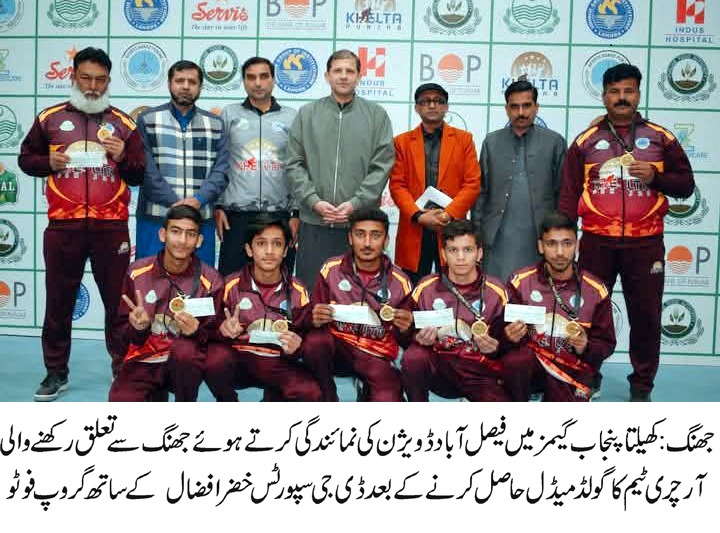 جھنگ(شیخ غلام مصطفیٰ) جھنگ کی معروف سید خاور شاہ نیشنل آرچری اکیڈمی کے کھلاڑیوں نے کھیلتا پنجاب گیمز میں فیصل آباد ڈویژن کی نمائندگی کرتے ہوئے میدان مار لیا، پنجاب بھر میں پہلی پوزیشن حاصل کرلی، رپورٹ عرفان حیدر سیال ڈویژنل بیوروچیف جھنگ آن لائن نیوز