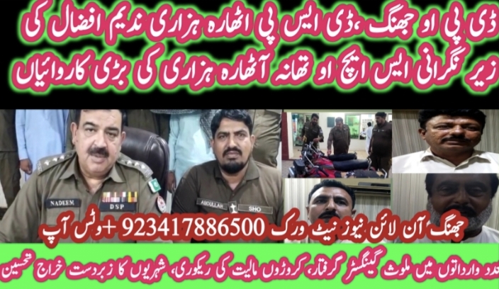 جھنگ (شیخ غلام مصطفٰی) ڈی پی او جھنگ راشد ہدایت ،ڈی ایس پی اٹھارہ ہزاری ندیم افضال کی زیر نگرانی ایس ایچ او تھانہ آٹھارہ ہزاری حافظ عبداللہ جپہ کی اپنی ٹیم کے ہمراہ بڑی کارروائیاں کی گئیں، متعدد گینگ،اشتہاری گرفتار ،دو کروڑ سے زائد مالیت کی ریکوری کی گئی، شہریوں کی جانب سے زبردست خراج تحسین، ڈی پی او جھنگ کی جانب سے تعریفی سرٹیفکیٹ سے نوازا گیا ، رپورٹ پروفیسر حکیم طاہر محمود جنجوعہ ،ڈاکٹر غلام اللہ فاروقی بیورچیف جھنگ آن لائن نیوز