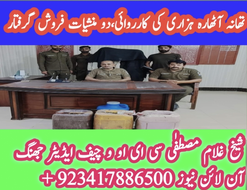 اٹھارہ ہزاری (شیخ غلام مصطفٰی) ایس ایچ او تھانہ آٹھارہ ہزاری انسپکٹر مہر اخلاق احمد نول کی زیر نگرانی اے ایس آئی چمن عباس، اے ایس آئی غلام عباس کی کارروائی، دو منشیات فروشوں سے بھاری مقدار میں شراب برآمد کرکے مقدمہ درج، نوجوان نسل کی رگوں میں زہر گھولنے والے ملزمان کسی رعایت کے مستحق نہیں، ایس ایچ او تھانہ آٹھارہ ہزاری ،رپورٹ رائے تجمل بھٹی ،پروفیسر حکیم طاہر محمود جنجوعہ