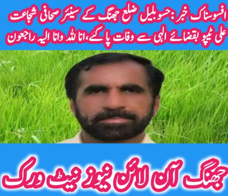 افسوسناک خبر :حسوبلیل ضلع جھنگ کے معروف و سینئر صحافی حکیم شجاعت علی ٹیپو بقضائے الہی سے وفات پا گئے ہیں، مرحوم کی نماز جنازہ آج ایک بجے دن ان کی رہائش گاہ واقع حسوبلیل میں ادا کی جائے گی، مرحوم روزنامہ خبریں سمیت دیگر اخبارات سے وابستہ تھے
