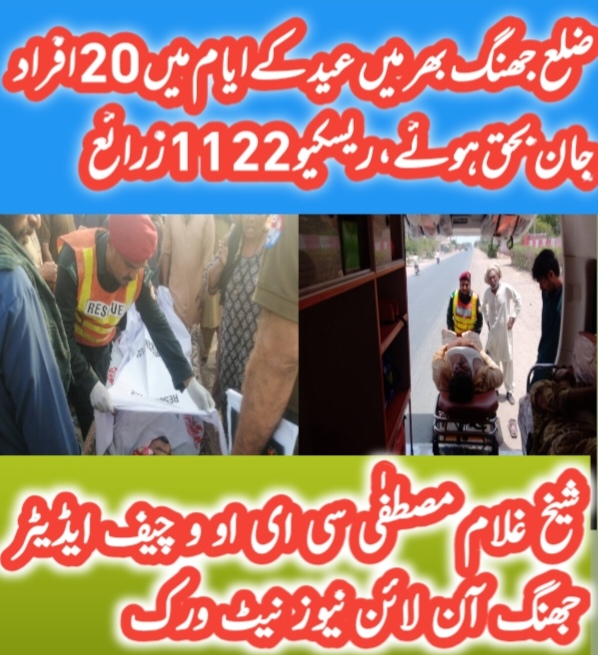 جھنگ (شیخ غلام مصطفیٰ) ضلع جھنگ بھر میں عید الاضحی کے موقع پر مختلف حادثات میں 20 افراد اپنوں سے بچھڑ گئے ،1194 ایمرجنسی کی کاروائیوں پر رسپانس دیا گیا، ڈسٹرکٹ ایمرجنسی آفیسر جھنگ 1122 ڈاکٹر میاں محمد اشفاق