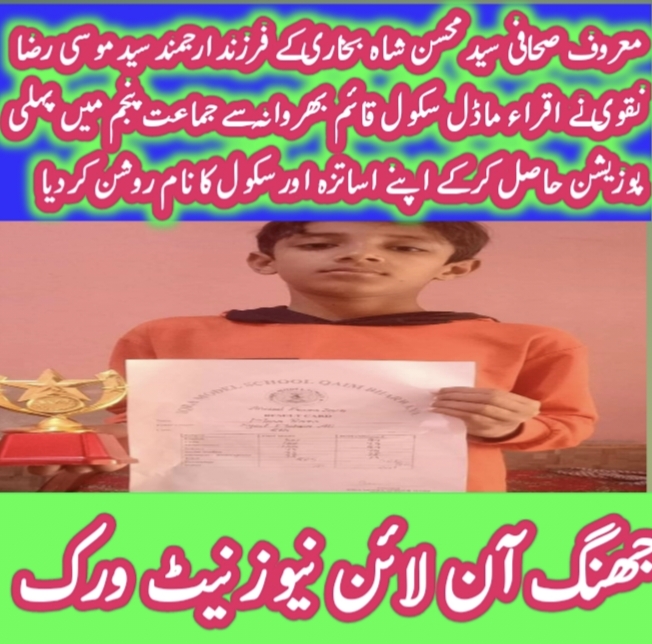 شورکوٹ(شیخ غلام مصطفٰی) تحصیل پریس کلب شورکوٹ کے سینیئر نائب صدر سید محسن شاہ نقوی کے بیٹے سید موسی رضا نقوی نے اقرا ماڈل سکول قائم بھروانہ سے کلاس پنجم میں پہلی پوزیشن حاصل کر کے اپنے اساتذہ اور سکول کا نام روشن کر دیا، سید موسیٰ نے اپنی کامیابی اپنے ٹیچرز کی محنت اور والدین کی دعاؤں کا نتیجہ قرار دیا ہے رپورٹ جاوید اقبال ملاح،ڈاکٹر غلام اللہ فاروقی ،مہر ریاض موہانہ بیورچیف جھنگ آن لائن نیوز