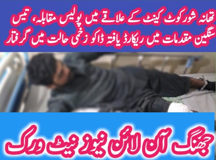 شورکوٹ کینٹ (شیخ غلام مصطفیٰ) تھانہ شورکوٹ کینٹ کے علاقے میں پولیس مقابلہ، تیس سنگین مقدمات میں ریکارڈ یافتہ ڈاکو زخمی حالت میں گرفتار، رپورٹ غلام اللہ فاروقی