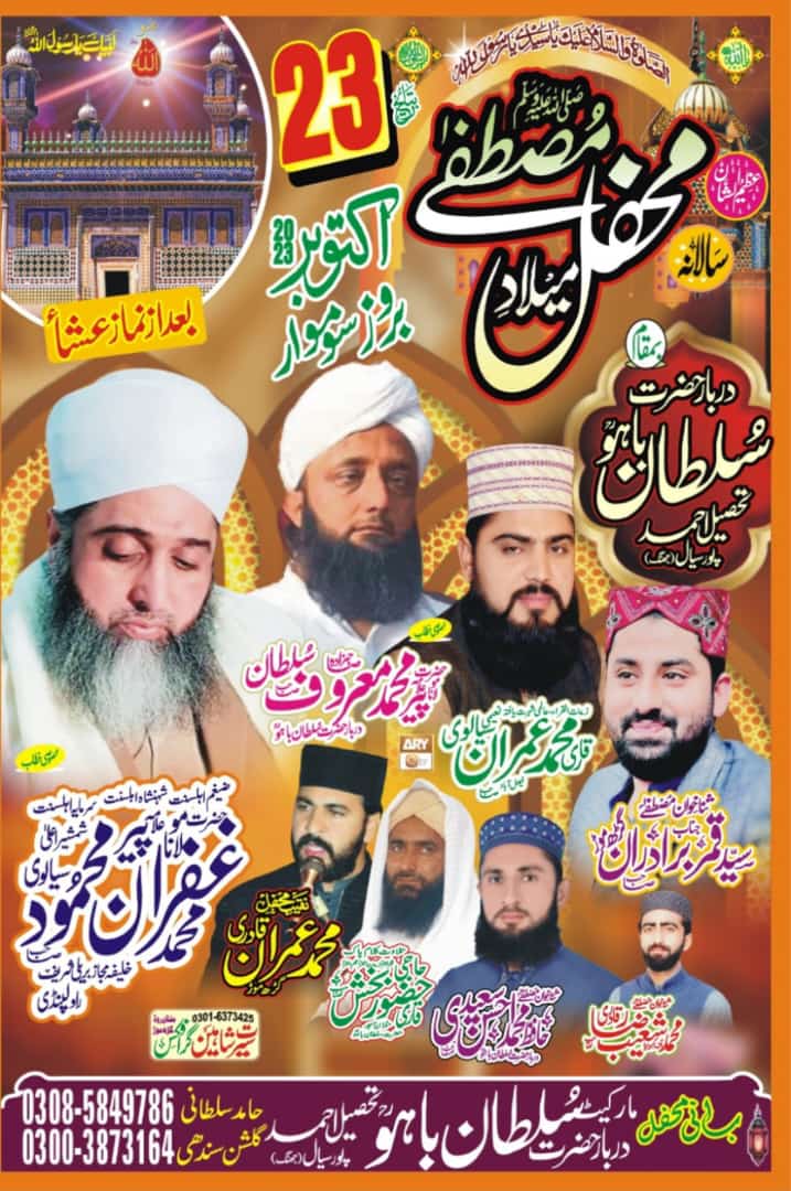 دربار حضرت سلطان باھو/ 23 اکتوبر بروز سوموار بعد نماز عشاؑ، چوک دربار حضرت سلطان باھو سالانہ عظیم الشان محفل نعت رسول ﷺ منعقد ہو رہی ہے، جسمیں قاری محمد عمران نعیمی فیصل آباد، صاحبزادہ محمد معروف سلطان، خصوصی خطاب حضرت علامہ محمد غفران محمود سیالوی راولپنڈی سمیت متعدد نعت خواں و دیگر قراء حضرات تشریف لا رھے ھیں، رپورٹ محمد گلشن سندھی /حامد علی سلطانی