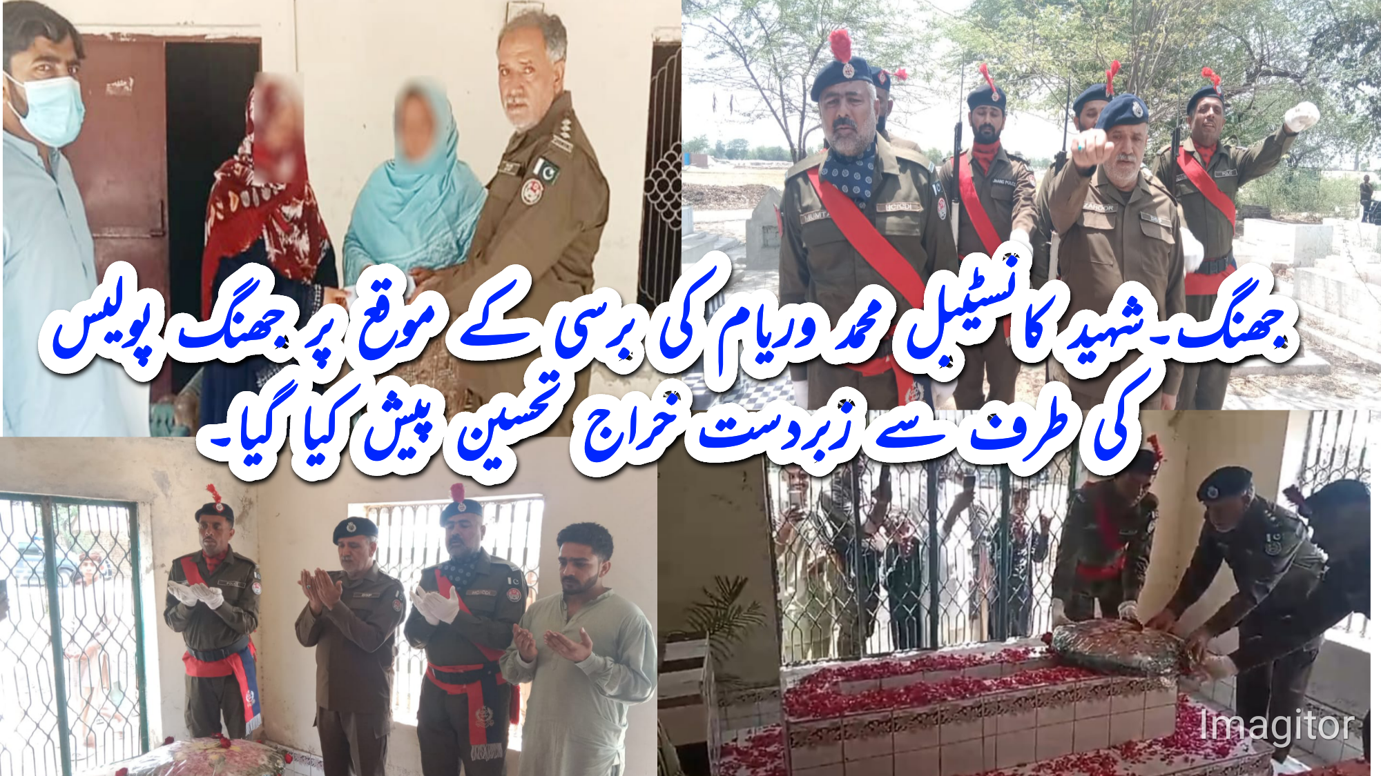 جھنگ ( شیخ غلام مصطفیٰ) شہید کانسٹیبل محمد وریام کی برسی کے موقع پر جھنگ پولیس کی جانب سے ذبردست خراج تحسین، شہداء پولیس ہمارا سرمایہ اور فخر ہیں، انکی قربانیاں ہمارے لئے مشعل راہ ہیں شہداء کی فیملیز کی ویلفئیر ہماری زمہ داری ہے، جسکا ترجیحی بنیادوں پر حل یقینی بنایا جا رہا ہے، رپورٹ حکیم طاہر محمود ،ڈاکٹر غلام اللہ فاروقی ،حامد علی سلطانی