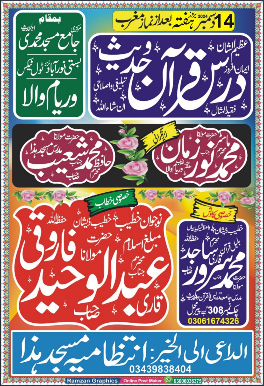 وریام والا ،14 دسمبر بروز ہفتہ بعد از نماز مغرب محمدی مسجد اہلحدیث بستی نوراباد امعروف ٹول ٹیکس والی بستی نزد وریام والا تحصیل شورکوٹ کے زیر اہتمام درس قرآن وحدیث تبلیغی واصلاحی منعقد ہورہا ہے جس میں خطیب پاکستان حضرت مولانا قاری عبد الوحید فاروقی اف سرگودھا درس قرآن ارشاد فرمائیں گے ،رپورٹ پروفیسر حکیم طاہر محمود جنجوعہ