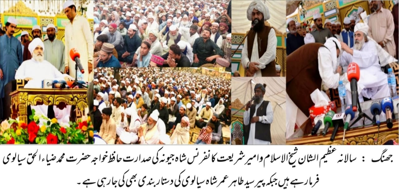 جھنگ (ریاض شاہد خان) سالانہ عظیم الشان شیخ الاسلام و امیر شریعت کانفرنس شاہ جیونہ شریف میں منعقد ہوئی جسکی صدارت نائب حضور امیر شریعت قلندر زماں ، پیر طریقت رہبر شریعت ، پیکر جرات و غیرت ، ضیائے چشت حافظ خواجہ حضرت محمد ضیاء الحق سیالوی حمیدی سجادہ نشین دربار عالیہ سیال شریف نے کی جبکہ میزبانی کے فرائض پیر سید محمد طاہر عمر شاہ چشتی حمیدی سیالوی شاہ جیونہ شریف نے انجام دیے۔۔